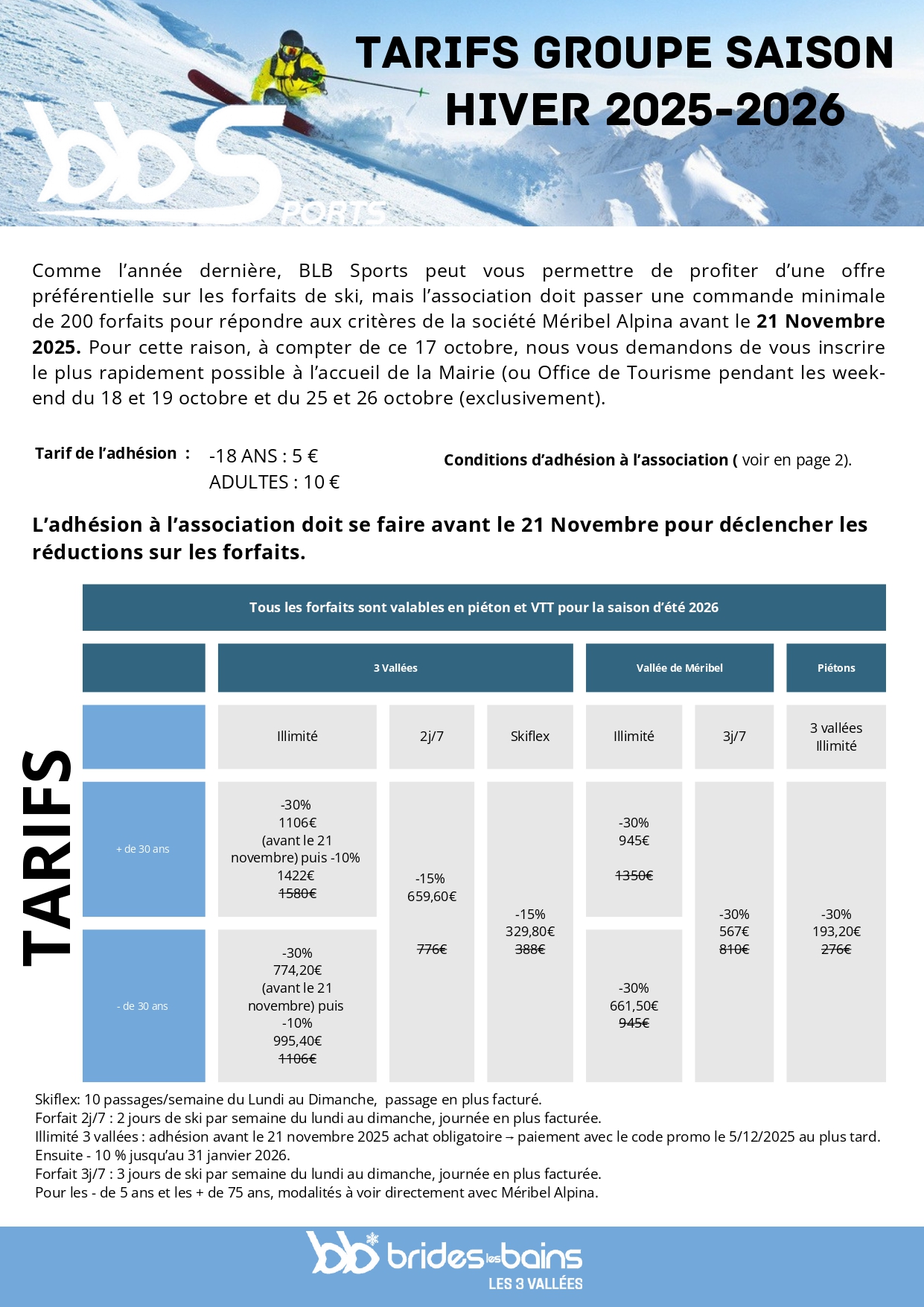 Cette adhésion permet de bénéficier des tarifs suivants sur les forfaits de ski hiver 25/26 :
