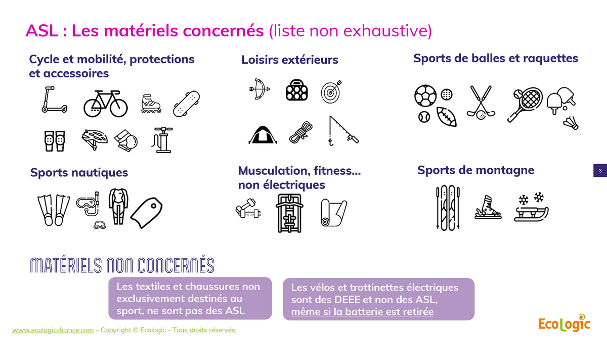 epuis le 1er janvier 2023, la Communauté de communes a mis en place la filière ASL (Articles de Sport et de Loisirs) dans ses 4 déchetteries. Les ASL sont des équipements utilisés dans le cadre d’une pratique sportive ou d’un loisir de plein air ; incluant les accessoires et les consommables, définis au R543-330 du Code de l’Environnement :