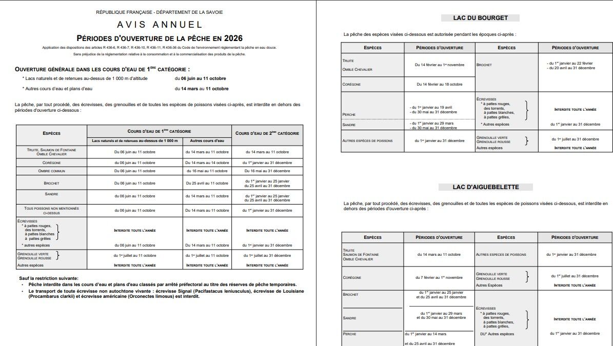 Avis annuel - Périodes d'ouverture de la pêche en 2026.