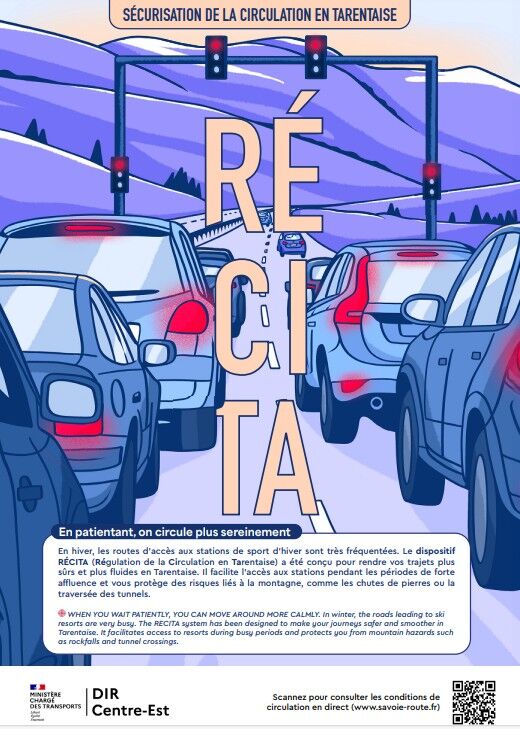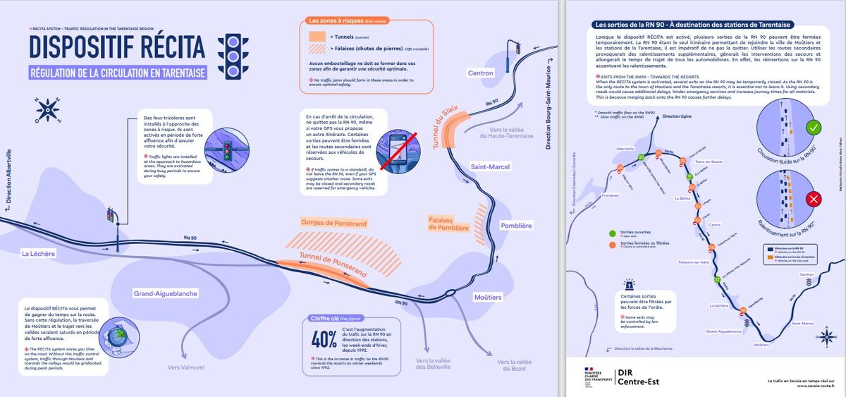 La direction interdépartementale des routes (DIR) Centre-Est, gestionnaire de la route nationale 90 reliant Albertville à Bourg-Saint-Maurice, vient d'éditer un nouveau support de communication destiné à expliciter le dispositif de régulation de la circukation en Tarentaise, dit RECITA, situé de part et d'autre de Moûtiers.