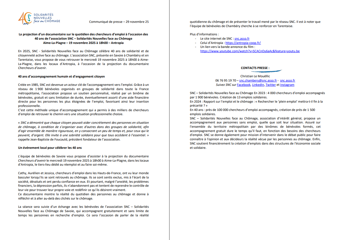 L'association SNC - Solidarités Nouvelles face au Chômage fête ses 40 ans à Antropia